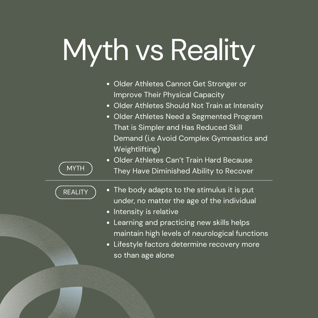 The third and fourth myths are that “Older Athletes Need a Segmented Program That is Simpler and Has Reduced Skill Demand (i.e Avoid Complex Gymnastics and Weightlifting)” and that “Older Athletes Can’t Train Hard Because They Have Diminished Ability to Recover”.