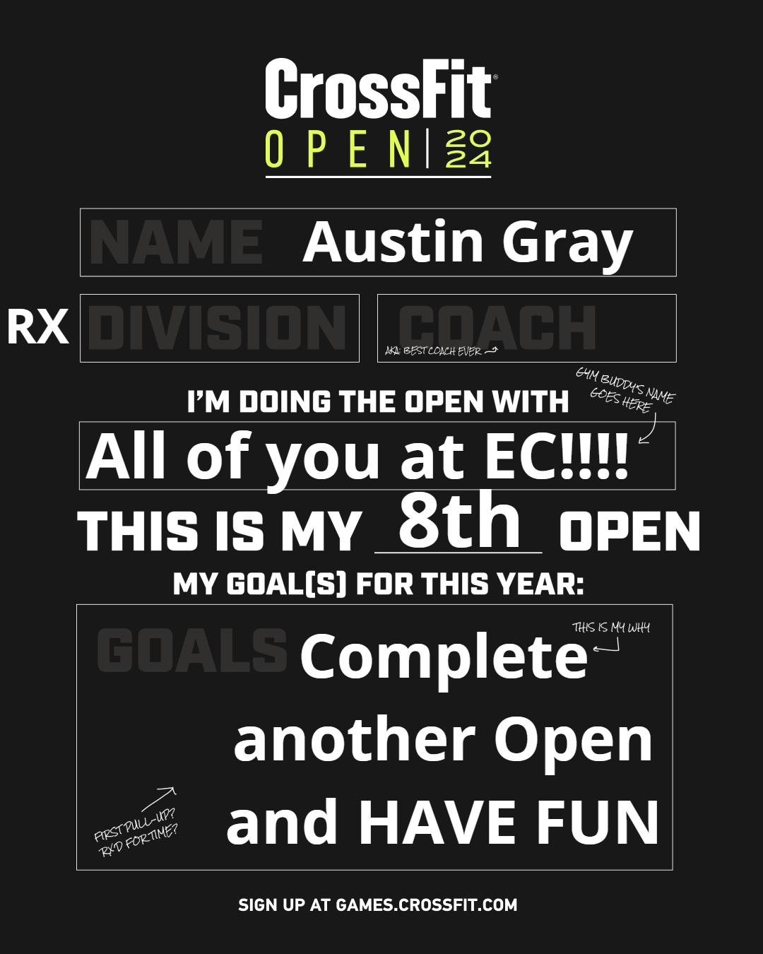 Second, signing up for the Open is like signing up for a half marathon. Most people wouldn’t run a half marathon just because yet a ton of people pay money to run one. They pay that money because it gives them something to work for. It holds them accountable knowing that they have invested real money into it. They end up finding a training regimen to help prepare so when it's game-time they can perform to the best of their abilities. The Open is the same thing except, guess what, you don’t have to find a training regimen because you are already doing that when you come into a class WOD.